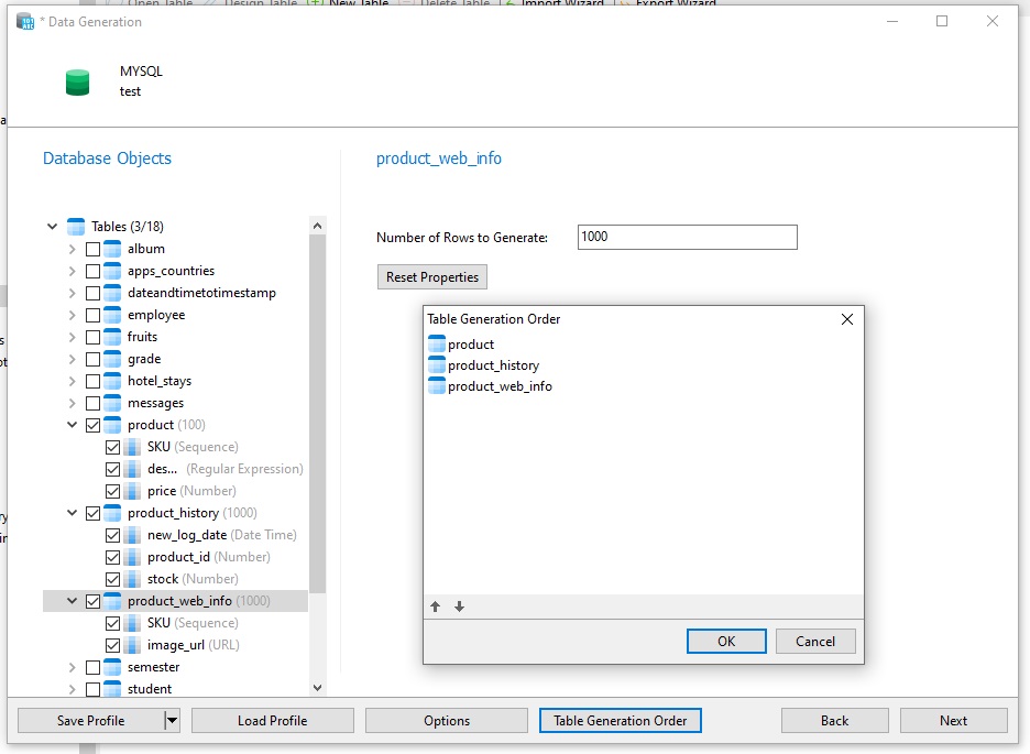 大多數組織不允許將生產數據複製到測試環境中,這是正確的!Navicat 16 的數據生成工具可幫助您創建大量測試數據。它可以在多個相關表上創建複雜的數據。整個過程由多步驟嚮導指導。在表選擇屏幕上,您可以選擇填充表的確切順序,以便不違反外鍵約束: